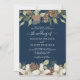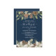 Winterkiefernkegel und weiße Blume schmücken die Ränder eines marineblauen Blau mit eleganter Schriftzeichen-Hochzeitseinladung.