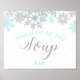 Winter Onederland erste Geburtstagsparty Warm up auf dem Soup Bar Schild blau und silber Schneeflocken.
