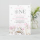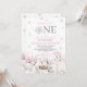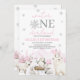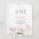 Winter ONEderland Birthday Invitation. Winter Girl First Birthday. Wonderland Silver Snowflakes Pink Pine Trees Arctic Animals.