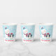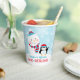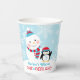 Winterwunderland "ONEderland" Erstgeburtstag Party Becher Design bietet einen glücklichen Schneemann und einen niedlichen kleinen Pinguin mit warmen Hüten und einem Schal und einem winterlichen Hintergrund mit einem Muster von Schneeflocken. Eisblau, Türkis, Rot, Weiß und Sondertext.
