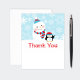 Winter Wunderland "ONEderland" erste Geburtstagsparty danke, dass die Karte Platz auf der Unterseite und zurück für eine handgeschriebene Dankeschön-Nachricht. Design zeigt einen glücklichen Schneemann mit Hut und Schal und einen niedlichen arktischen Pinguin mit Weihnachtsmannmütze und Nummer "1" auf seinem Bauch, der im Schnee schwingt. Der Hintergrund hat ein Muster von Schneeflocken. Eisblau, Türkis, Rot und Weiß mit schwarzen und grauen Akzenten.