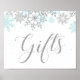Winter Geschenke aus Onederland Schild in Blau und Silberschneeflocken.