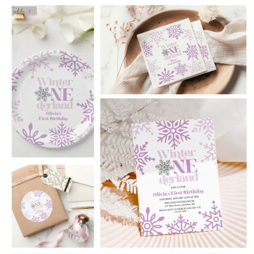 Winter Onederland erster Geburtstag mit lila Schneeflocken.