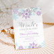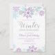 Winter Einladung zum ersten Geburtstag in Onederland mit lila, silbernen und blauen Schneeflocken.