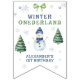 Aquarellfarbener Kindergeburtstag Wasserfarbener Schneemann, Schneeflocken, immergrüne Kiefernbäume, grüner Bogen.