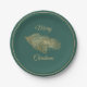 Elegante Kelly grüne Teller mit goldfarbenem Klingelrand und goldener Tongrafik von Kiefernzapfen und Kiefernzweig, in der Mitte. Frohe Weihnachten in goldfarbenem Text ist bereit, mit Ihrer Botschaft zu personalisieren.