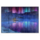 Die Nordlichter leuchten über einer schneebedeckten Winterlandschaft. Die schneebedeckten Felder werden von rosa, lila, blauen und grünen Schatten erhellt und von einem eingefrorenen See reflektiert. Am Wasser steht eine Hütte mit warmen Lichtströmen aus den Fenstern und Rauch aus dem Kamin - eine gemütliche Zuflucht vor der funkelnden Kälte.