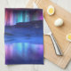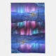 Die Nordlichter leuchten über einer schneebedeckten Winterlandschaft. Die schneebedeckten Felder werden von rosa, lila, blauen und grünen Schatten erhellt und von einem eingefrorenen See reflektiert. Am Wasser steht eine Hütte mit warmen Lichtströmen aus den Fenstern und Rauch aus dem Kamin - eine gemütliche Zuflucht vor der funkelnden Kälte.
