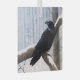Ein schwarzer Rabe, der auf einem Baumzweig sitzt. Winter und Bäume mit Schnee.
