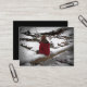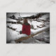 Diese Künstler-Trading Card kennzeichnet eine durchdachte junge Frau in einer roten Jacke, die auf einem gefallenen Klotz an einem teilweise gefrorenen Nebenfluss sitzt, der über die schneebedeckte, kalte Winterszene nachdenkt.