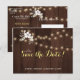 Rustikale, elegante Winterhochzeit mit stilvollem Save the Date Template Postcard auf dunkelbraunem Stallholz mit einem kleinen, wunderschönen, weißen Blume-Bouquet und einer Reihe von binkelfarbenen Lichtern und einem trendigen Gold- und Weiß-Kalligraphie-Skript. +++++++ Persönliche Gestaltung mit Ihren Daten! Sie können wählen, um es anzupassen, indem Sie die Hintergrundfarbe Schriftart und Farben der Schrift. ++++++++++++++++++ Die gerettet Hochzeitskarte eignet sich hervorragend für Hochzeitsfeiern im rustikalen Landhausstil.