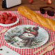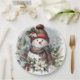 Nestled among pinecones and poinsettias, a cheerful snowman greets the season with warmth and whimsy. Holly berries and frosted branches frame a moment of quiet joy beneath softly falling snow.