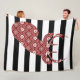 Eine Decke, die ein Rotwild mit weißem Schneeflocke- und Zickzackmuster über einem gestreiften Schwarzweiss-Hintergrund kennzeichnet.