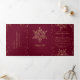 Elegante goldene Schneeflocken und glänzende, bordeauxrote dreifach geflieste Hochzeitseinladung mit vollständig bearbeitbarem Text. Alle Ihre Daten, Informationen und Antwortkarte auf der gleichen Einladung.