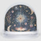 A unique snow glob features crescent moons, gold branches and other solstice elements on a celestial background.