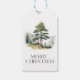 Dieses festliche und elegante Tag-Design verfügt über zwei Linien von individuellem Text (gezeigt mit "Frohe Weihnachten" und Ihrem Namen oder Ihrer Familie-Unterschrift), überragt von einem Aquarellkiefer in gedämpftem Jägergrün mit goldenen Sternen.