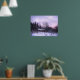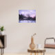 Dieses Poster zeigt eine Wintersonnenuntergangsszene. Ein rotes Haus ist in den Bäumen versteckt, und die Lichter scheinen im Inneren. Auf dem Feld hat sich reiner weißer Schnee aufgestaut. Die Wolken im Himmel leuchten mit Regenbogenfarben in Orange, Rosa, Gelb, Blau und lila.