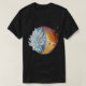 Depiction of a stylized globe in which two seasons meet—winter and autumn. On the left side, a delicate, frosty plant spreads out, symbolizing cold and tranquility. On the right side, autumnal leaves glow in warm shades of red and gold, embodying transition, passing, and change. The gentle division between the two halves is reminiscent of yin and yang, the balance between cold and warmth, endings and new beginnings.