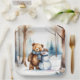 Niedlicher Teddybär in Aquarellfarbe im Winterwald mit Schneemann.