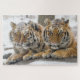 Die Tiger kuscheln auf einem Stein an einem schneebedeckten Wintertag.