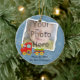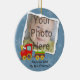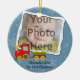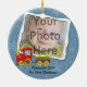 Spaß und niedlich personalisiertes Foto Weihnachtsfeier. Winterspielzeugbahn-Design für Baby oder Kinder. Kann ein großartiges Baby's First Christmas Ornament. Fügen Sie Ihr eigenes digitales Foto und Ihre Überschrift hinzu. Weiße, schneebedeckte Rahmen mit hellblauen und weißen Schneeflocken im Hintergrund und ein farbenfroher Spielzeugzug in rot, gelb, orange und grün! Ein perfektes Memento, um für jedes besondere Jahr zu bleiben.