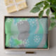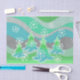 Eine moderne, stilvolle Winterlandschaft mit mattierten Kiefern und glitzernden Schneeflocken. Zierpapier mit einem grünen, blauen, silbergrauen und weißen, anpassbaren Design für Sie, um mit Ihrem eigenen Text, Bildern und Ideen zu personalisieren. Mit einem digital verbesserten Bleistift gezeichnet Bild.