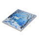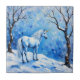 Eine traumhafte Szene fängt ein Einhorn in einem Moment ruhiger Betrachtung inmitten eines sanften Schneefalls ein. Die Hauptfarben sind coole Blues, eisige Weiße und Silberflüster. Das Einhorn mit fließender Mähne und Schwanz wird mit etwas stärkerem Pigment dargestellt, um sich herauszustechen, während der fallende Schnee mit winzigen, zarten Spattermarken und leichteren Waschmitteln entsteht. Der Boden ist eine Mischung aus schneeweißen und blauen Schatten, mit nackten Laubäumen, die als weiche, verschwommene Linien im Hintergrund erscheinen, was die ruhige und ätherische Stimmung verstärkt. Die Gesamtwirkung ist zart und fast kristallklar, perfekt für einen ruhigen Innenraum.