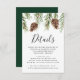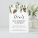 Rustikale Hochzeitskarte mit einem obersten Rand von Aquarellpineconen und Kiefernbällen. "Details" wird in einem modernen Kalligraphieskript angezeigt, in dem Ihre Hochzeitsdetails unten dargestellt sind. Entworfen, um mit unserer Winter Watercolor Pinecone Hochzeitskollektion zu koordinieren.