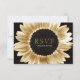 Diese kühnen, aber eleganten 5" x 3,5" Hochzeitskarten sind mit einer großen Sonnenlicht goldenen Sonnenblume auf schwarzem Hintergrund ausgestattet. Auf der Rückseite befinden sich Platzhalter mit Zeilen, damit der Gast seinen Namen ausfüllen und seine Wahl für die Teilnahme auswählen kann.