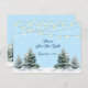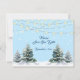 Wunderschöne Winterhochzeitkarte Save the Date mit leuchtend leuchtenden Saitenlichtern, schneebedeckten Kiefern und leckeren Schneeflocken. Das ist ein wunderschönes Winterthema für Ihre Hochzeit.