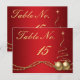 Diese stilvolle doppelseitige Weihnachts-/Winterhochzeit-Tischnummer mit schattigen, roten Farbtönen und subtilen Schneeflocken. Ein stilisierter Weihnachtsbaum in glänzendem Gold schwingt ihn ganz nach oben auf der rechten Seite der Karte, oben mit einem leuchtenden Stern verziert. Zwei große goldene Bausteine und eine Gartenreihe zieren den Vordergrund.