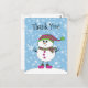 Schicken Sie uns ein Dankeschön mit diesem niedlichen Schneemann. Sie ist in ihrem gestreiften rosa und grünen Schal und Hut mit passenden Stiefeln gekleidet und steht auf einem Schneemond, wobei Schneeflocken herumfallen.