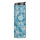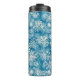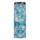 White winter pattern with different shapes and sizes of large and small white snowflakes on a blue background.
