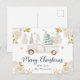 Elegantes Watercolor Winter Gold Pine Pine Trees Design mit einem weißen LKW, Schneemann, Goldschneeflocken und Glitzer Blume aus Weiß und Gold