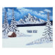 Ein Poster mit einer schönen Winterlandschaft inklusive schneebedeckter Berge, rustikaler Hütte und schneebedeckten Evergreens. Das Bild kann personalisiert sein. Sie haben auch die Möglichkeit, Text hinzuzufügen. Original-Kunstwerk von W.B.