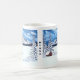 Eine Tasse mit einer wunderschönen Winterlandschaft inklusive Berg, rustikaler Hütte und Evergreens nach einem starken Schneefall. Bild und Text können personalisiert sein. Original-Kunstwerk von W.B.