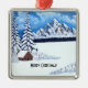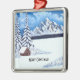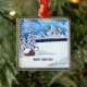 Ein Metallschmuck mit einer schönen Winterlandschaft inklusive schneebedeckten Bergen, rustikaler Hütte und schneebedeckten Evergreens. Original-Kunstwerk von W.B.
