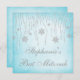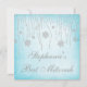 Stilvolle Illustrationen von Diamantschmuck und Schneeflocken sind auf dieser aquamarinen blauen Bat Mitzvah Wintereinladung zu sehen. Elegant und formell - perfekt für ein winterliches Wunderland Bat Mitzvah Party! Designs sind flache gedruckte Illustrationen/Grafiken - NICHT AKTUELLE DIAMOND EMBELLISHMENTS.