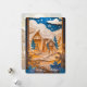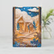 This enchanting Christmas card features a layered paper-cut style winter scene, with snowy hills, tall evergreens, and a cozy cabin nestled beneath drifting clouds and falling snowflakes. The rich blend of golden tones, icy whites, and deep blue sky creates a magical holiday atmosphere that feels both elegant and heartwarming. Perfect for sending season’s greetings, it captures the quiet beauty and wonder of Christmas in a snowy woodland.
