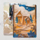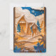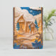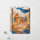 This enchanting Christmas card features a layered paper-cut style winter scene, with snowy hills, tall evergreens, and a cozy cabin nestled beneath drifting clouds and falling snowflakes. The rich blend of golden tones, icy whites, and deep blue sky creates a magical holiday atmosphere that feels both elegant and heartwarming. Perfect for sending season’s greetings, it captures the quiet beauty and wonder of Christmas in a snowy woodland. Add your holiday picture on the back and make it your own.