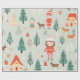 Dieses Bild ist ein skurriles Wintermuster mit stilisierten Figuren in warmer Kleidung, freundlichen Rentieren, gemütlichen Häusern und einer Auswahl an Bäumen unter einem leichten Schneefall. Das Farbschema verwendet eine ruhige Palette an Grüntönen, Orangen und Cremes, um eine fröhliche und doch beruhigende Winterlandschaft zu schaffen. Das spielerische Design erinnert an ein Geschichtenbuch, ideal für Kindertextilien oder saisonale Dekorationen.