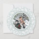 Elegante Urlaubsfotokarte in einzigartiger runder Form mit einem beliebten Foto umrahmt von einem Kranz aus weißem Winterblättern auf einem eisblass-grün Hintergrund. Personalisieren Sie Ihre Feiertage mit einem ganz persönlichen Gruß (mit "Haben Sie sich ein frohes kleines Weihnachtsfest" gezeigt), Ihren Namen oder Familiennamen und das Jahr in schick graue Schrift.