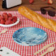 Hübsche Teller mit einem Bild eines schönen, schneebedeckten Pinienwaldes. Ein schöner Wintertag mit blauem Himmel und fallendem Schnee.