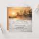 Eine elegante Hochzeitseinladung mit einer Winterlandschaft bei Sonnenuntergang mit festlichen, funkelnden Saitenlichtern in den Bäumen. Die warmen Farbtöne passen perfekt zu den goldenen und goldenen Elementen in Kerzenlicht oder Rose für Ihre Hochzeit. Diese Einladung enthält auch eine passende RSVP-Karte. Schön für eine Winterhochzeit.