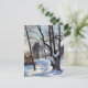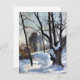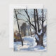 Schneedecke in einer ruhigen Landschaft mit einem prominenten, blätterlosen Baumgussschatten auf dem Boden. Ein malerisches Haus steht zu den links, mit hohen Bäumen, die in die Ferne unter einem klaren Himmel führen.