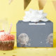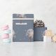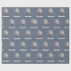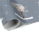 Weiße, schneebedeckte Eule in Schneeflocken mit Vögeln und Vollmond auf winterblauem Hintergrund.