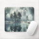 Eine ruhige Waldlandschaft spiegelt sich perfekt auf dem stillen Wasser wider, mit sanftem Licht, das durch den frostigen Nebel filtert