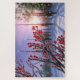 Hellrote Beeren, die vor dem Hintergrund eines glühenden Wintersonnenuntergangs hinter kahlen Bäumen und dunklen Kiefern mit glitzerndem Eis bedeckt sind.