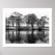 Ein Schwarz-Weiß-Foto von Bäumen auf einem schneebedeckten Ufer, das sich im großen Teich unten widerspiegelt und ein Wintermuster schafft.