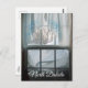 Ein Frühjahrsvorhang umrahmt ein Fenster mit Blick auf einen Winterschneeweg. Der Text ist leicht zu ändern und optional.